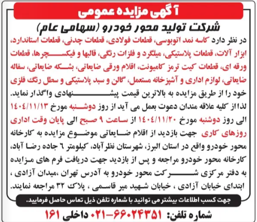 آگهی مزایده کاسه نمد اتوبوسی، قطعات فولادی، قطعات چدنی، قطعات استاندارد، ابزار آلات، قطعات پلاستیکی، میلگرد و فلزات رنگی، قالبها و فیکسچرها، قطعات ورقه‌ای، قطعات کیت ترمز کامیونت، اقلام ورقی ضایعاتی، بشکه ضایعاتی، لوازم اداری و آشپزخانه مستعمل، گالن و سبد پلاستیکی و سطل رنگ فلزی